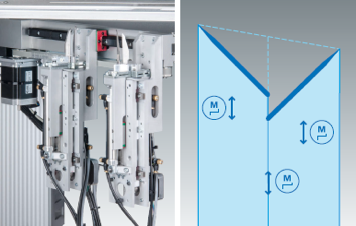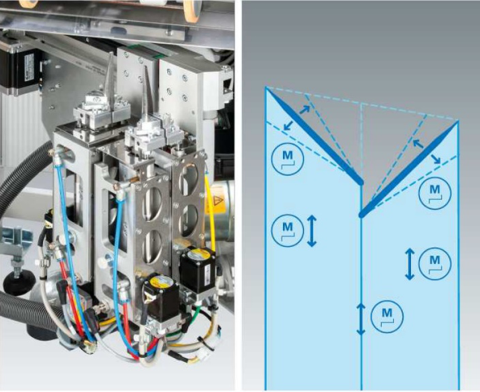 * Statie cutite de colt multi-functionala, controlata de motoare pas cu pas pentru toate cele 4 cutite, acum si cu posibilitatea modificarii nclinatiei fiecarui cutit. In funcție de tipul material, toate cele patru cutite de colț pot fi setate si stocate individual, pentru fiecare program in parte.