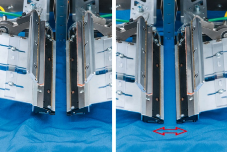 * Sistem programabil de intindere a clemelor de transport controlat de motoare pas cu pas, pentru o mai buna intindere a materialului inainte de coasere taiere precisa a cutitelor de colt