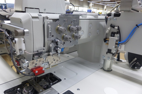 756 A – pentru buzunare drepte sau oblice (inclinate) la pantaloni, captuseli sau haine, cu statie multifunctionala a cutitelor de colt si cu transport cu acul in material.